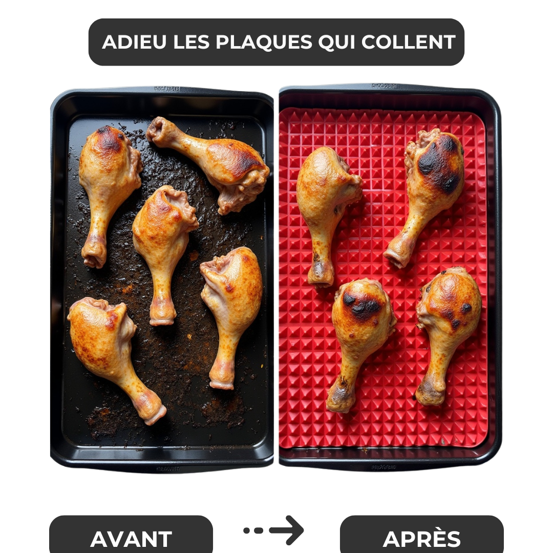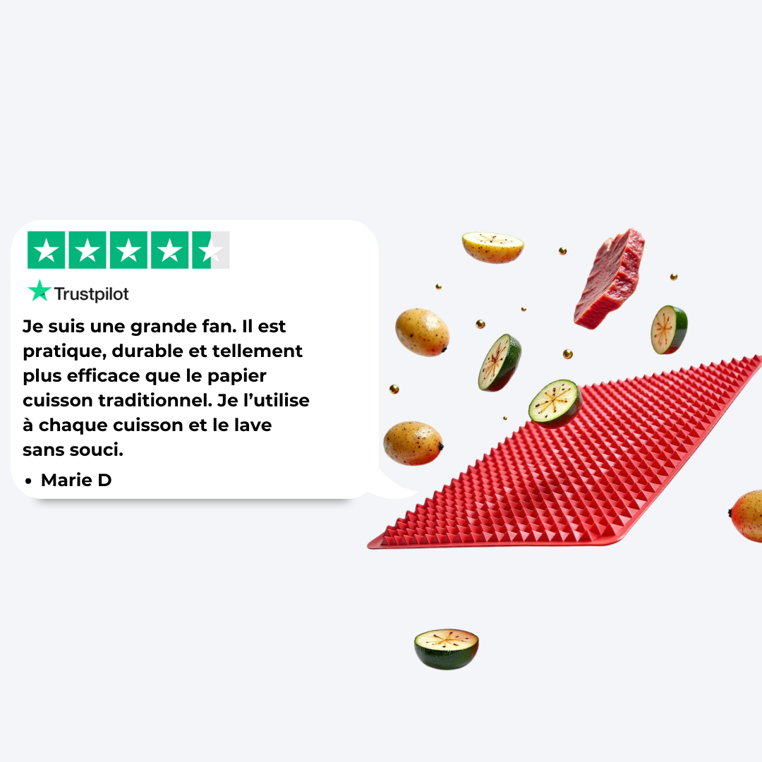 Notre tapis en silicone alimentaire sans BPA résout tous ces problèmes en une seule solution. Il remplace à vie le papier cuisson, supporte jusqu’à 230 °C, est réutilisable plus de 1000 fois, et garantit une cuisson homogène, propre et sans ajout de matière grasse.